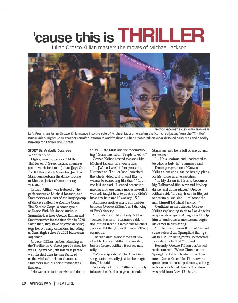 Lights, camera, Jackson! At the Thriller on C-Street parade, attendees got to watch freshman Julian [Jay] Orozco Killian and choir teacher Jennifer Stammers perform the dance routine to Michael Jackson’s iconic song “Thriller.”